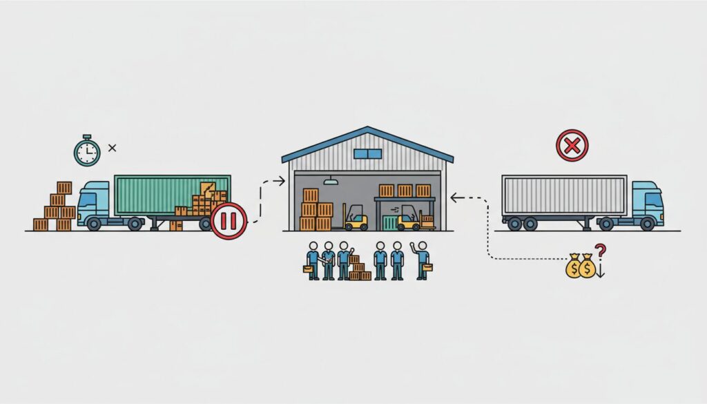 - 16:30のゲートクローズ問題: 港湾労働の慣行上、多くのヤードは16:30分頃にゲートを閉鎖します。荷待ちや周辺道路の渋滞でこの時間に1分でも遅れると、翌日回しとなり、その瞬間にフリータイムを徒過してディテンションチャージが確定します。
