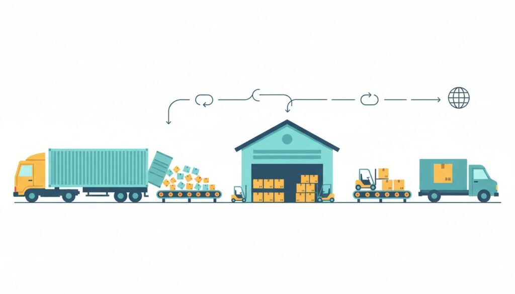 - 仮置きスペースの最適化:コンテナから荷降ろしした直後の貨物を一時保管するスペースは、コンテナのテールエンドから最短距離に配置します。歩行距離を1メートル縮めるだけで、40フィートコンテナ1本あたりトータルで数キロの歩行削減に繋がります。