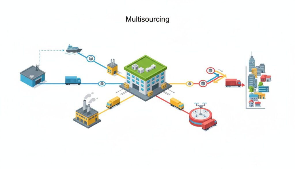 単一サプライヤーへの過度な依存から脱却するための高度な購買戦略です。例えば、同一仕様の重要部品をA社に70%、B社に30%の割合で発注することで価格競争を促し、コスト最適化を図ります。しかし現場では、「A社とB社で微妙に異なる公差(品質のブレ)や、図面に表れない暗黙知を、自社工場の組み立てラインや入荷検品プロセスでいかに吸収するか」という、緻密なすり合わせが最大の課題となります。 - 物流・配送視点(輸配送網の再構築)
