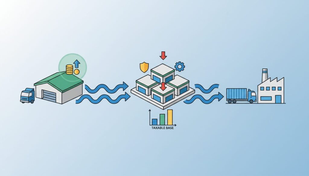 | 固定資産税・都市計画税(家屋・償却資産) | 新設・増築した家屋および償却資産の課税標準を、新たに固定資産税が課せられることとなった年度から5年間にわたり「5/6」に軽減。 | 建屋評価額が12億円の場合、通常の固定資産税(年額約1,680万円)が約1,400万円に圧縮され、5年間で1,400万円以上の純粋なキャッシュアウト削減となる。対象となる最新のマテハン機器(償却資産)も含めれば効果はさらに膨らむ。 |