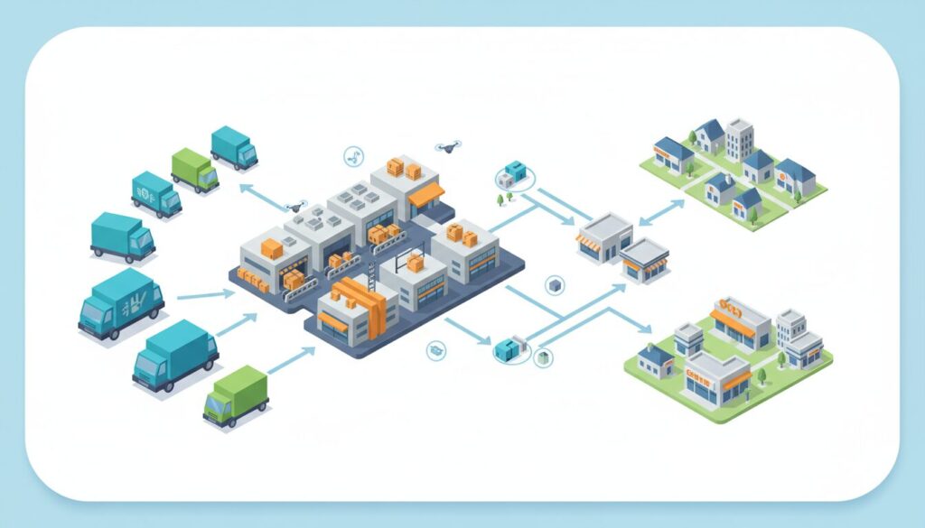 - 荷主と物流事業者(倉庫・運送)の垂直連携:運送事業者や3PL事業者が主導し、複数荷主の貨物を自社拠点でクロスドック(積み替え)し、共同配送網を構築する。