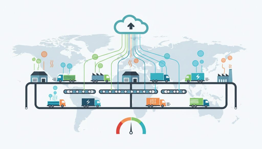 トラックのデジタルタコグラフ(デジタコ)や動態管理システムから得られる実際のGPS走行距離・燃費データ、倉庫内のスマートメーターによる分電盤ごとの電力使用量、さらには電動フォークリフトや無人搬送車(AGV)の稼働状況を、IoTセンサー経由でクラウドへ直接吸い上げます。