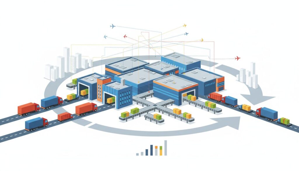 サプライチェーンマネジメント(SCM)の再構築において、配送拠点をどのように配置するかは物流部門の責任者が最も頭を悩ませる経営課題です。本セクションでは、まず物理的な施設としての「物流ハブ(拠点)」と、配送ネットワークの戦略としての「ハブ&スポーク」を明確に定義し、現場でどのようなオペレーションが展開されているのかを紐解きます。