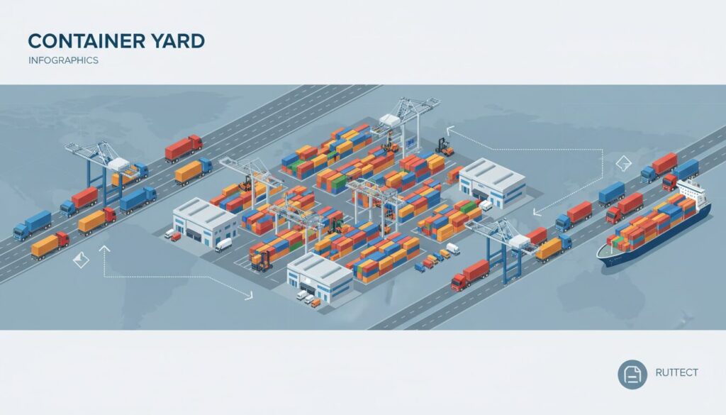 | 立地と主目的 | 港湾直結(ターミナル内)。船積み・水揚げに向けた実入りコンテナの保管と引き渡し。 | 内陸・港湾周辺。空コンテナのストックや、ターミナル混雑時の代替保管場所(インランドデポ等)。 |